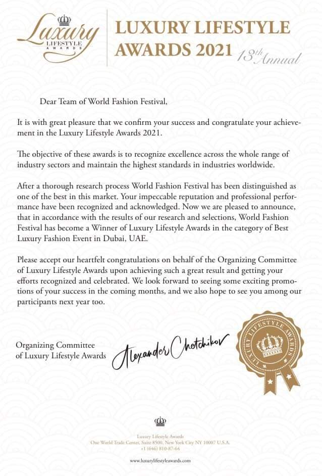 WFFA (World Fashion Festival Awards) has proudly been announced by the Luxury Lifestyle Awards 2021 (New York / Season 13) as the selected and appointed WINNER πof the category:
